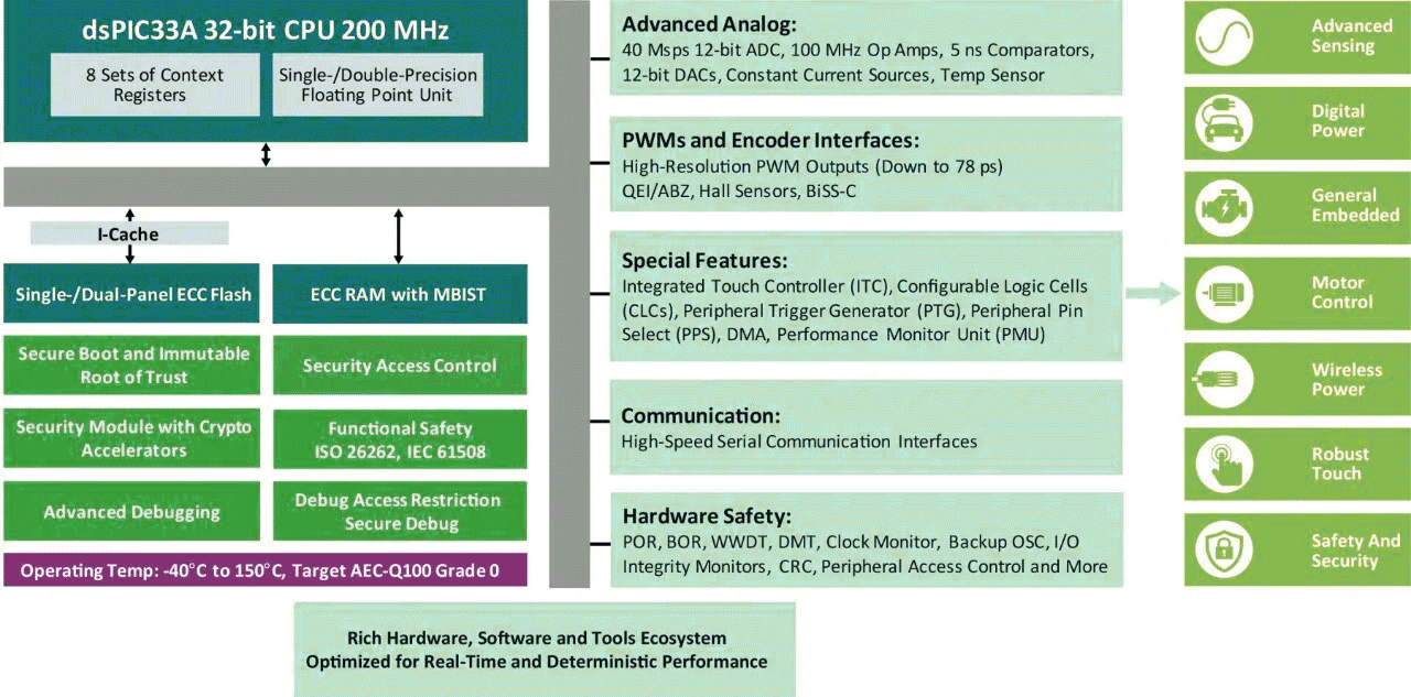 The dsPIC33A family of DSCs with low latency responsiveness is designed for high-performance and real-time precision control applications. These DSCs combine the advantages of MCUs with the signal processing capabilities of Digital Signal Processors (DSPs), making them suitable for a wide variety of applications that require quick control loop computations using multiple sensor inputs.
